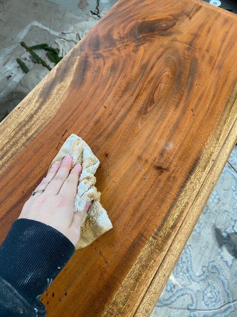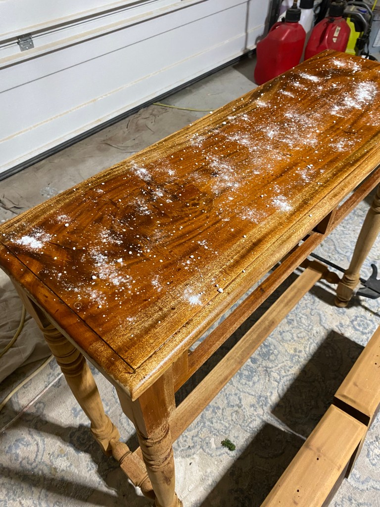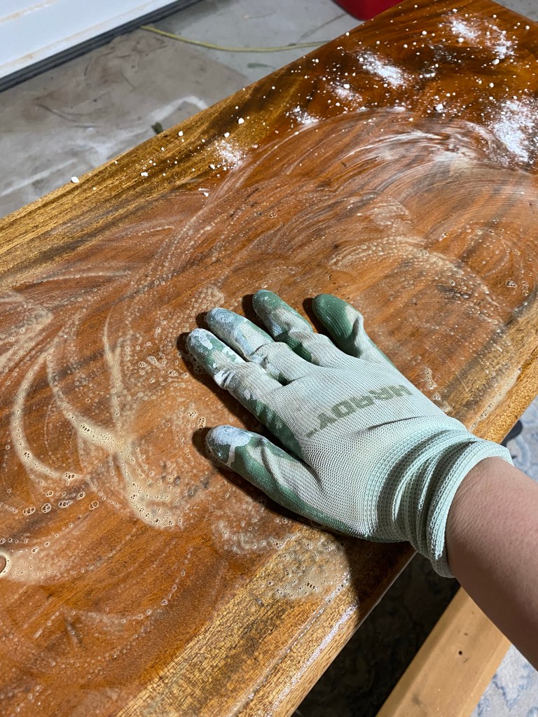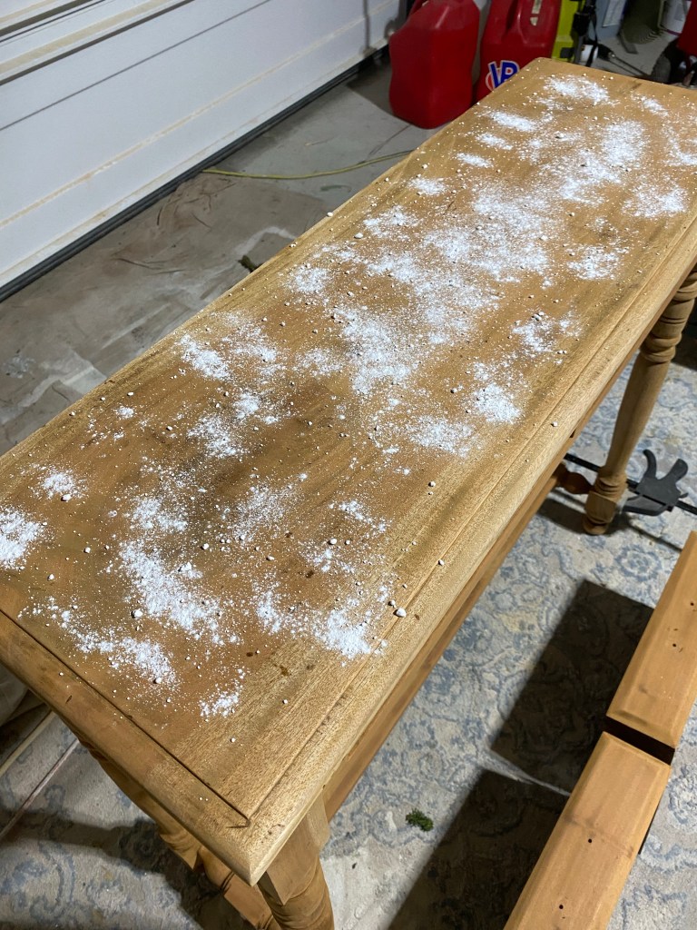 Sprinkle Bar Keepers Friend Cleanser to a freshly sanded and clean wood surface.
